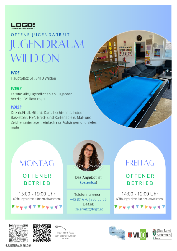 Alle Jugendlichen im Alter von 10 bis 26 Jahren sind in unserem Jugendraum Wild.On herzlich willkommen! Die Adresse des Jugendraums ist Hauptplatz 61, 8410 Wildon. Der Eingang befindet sich straßenseitig (gut an den blauen Fensterfolien zu erkennen).
